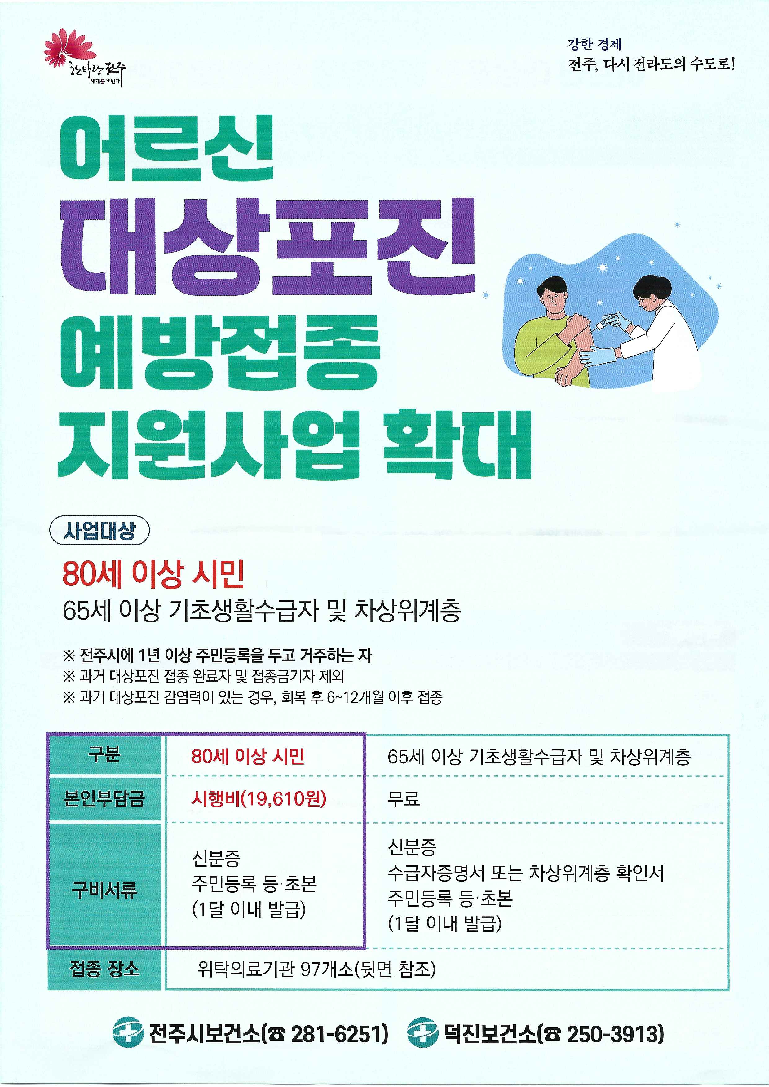 기초생활수급자와 차상위계층만 가능했던 전주시 ‘어르신 대상포진 예방접종’ 대상이 80세 이상 시민까지 확대되었습니다. 이와 관련하여 요양요원이 어르신께 안내하고, 필요한 절차를 도움 드립니다.