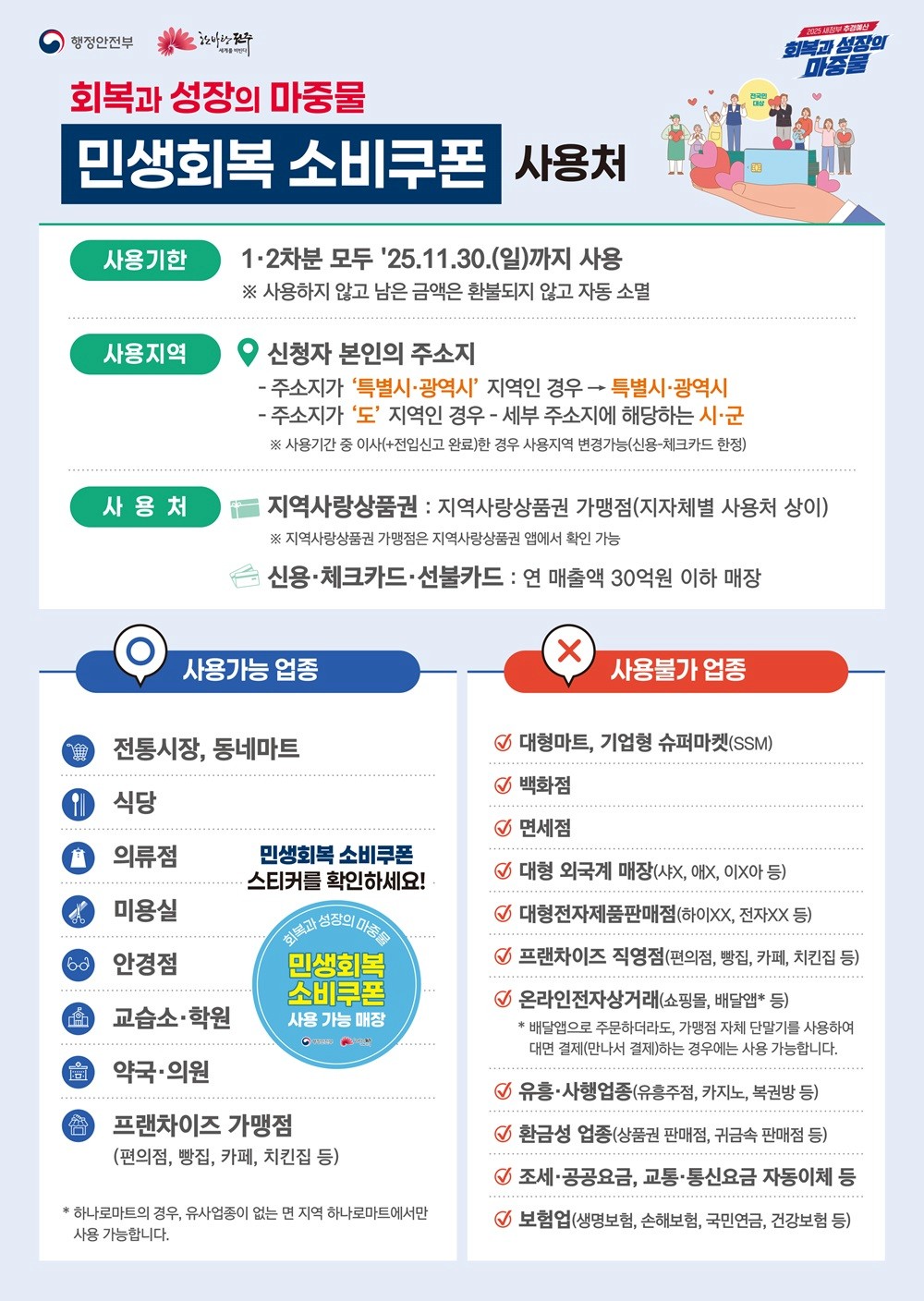 민생경제 회복을 위한 조치로 소비활성화와 소상공인 및 자영업자 매출확대를 위해 민생회복 소비쿠폰 지급