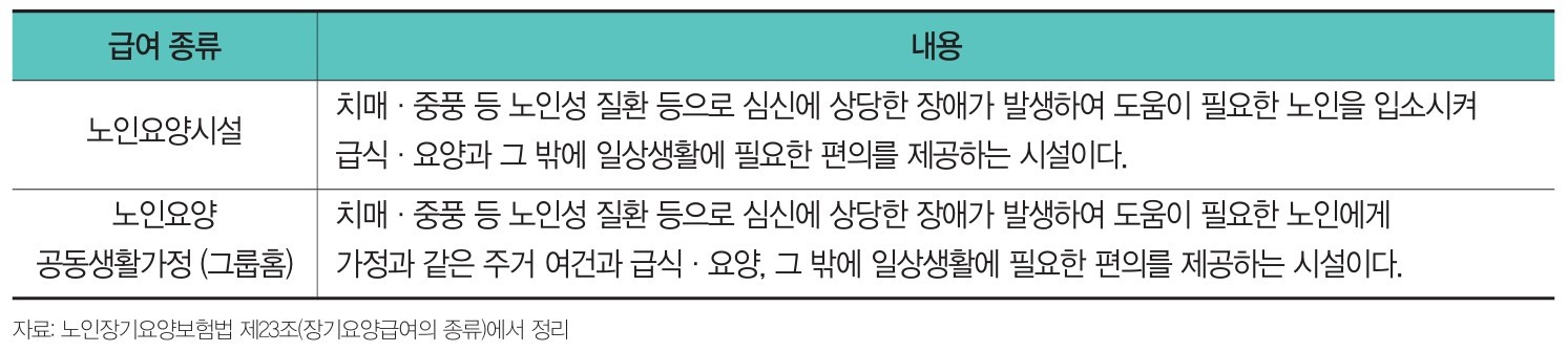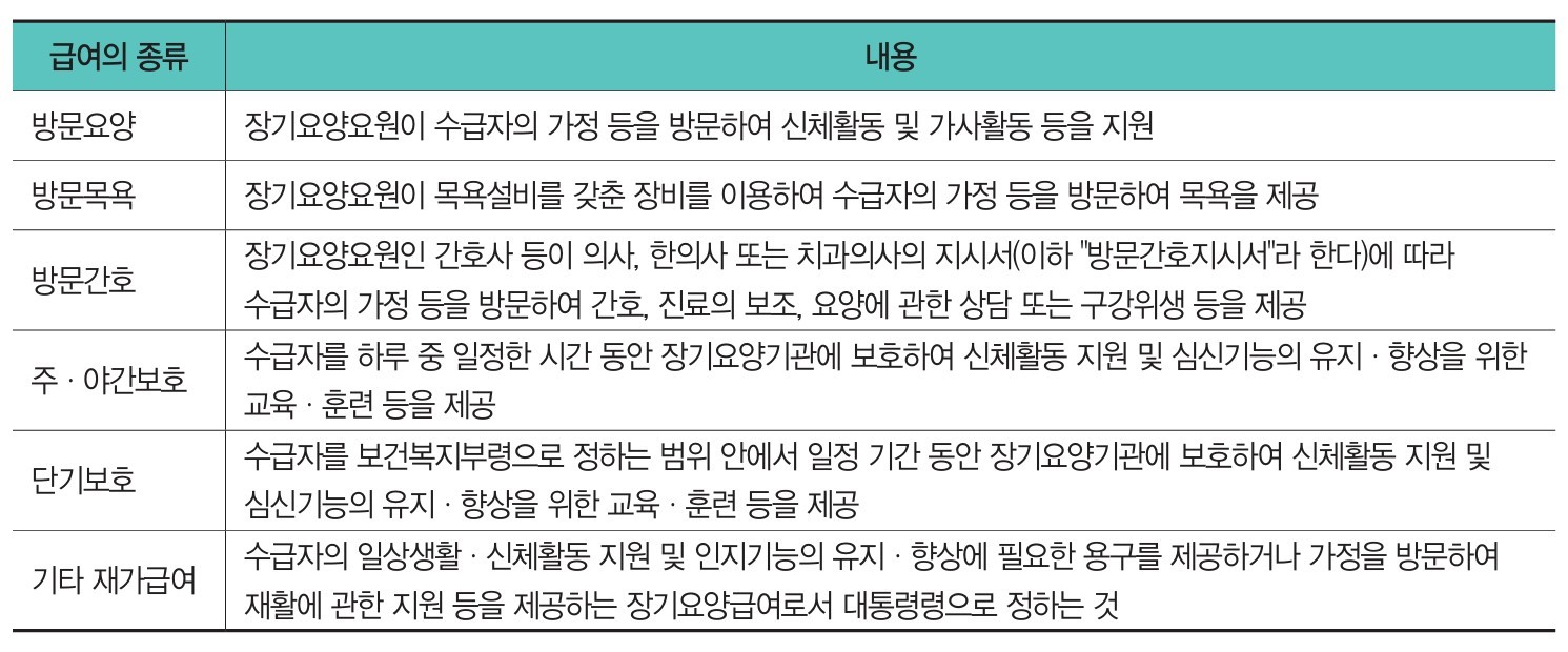 [재가서비스] 방문요양, 방문목욕, 방문간호, 주/야간보호, 단기보호 + [시설서비스] 요양원, 공동생활가정(그룹홈)